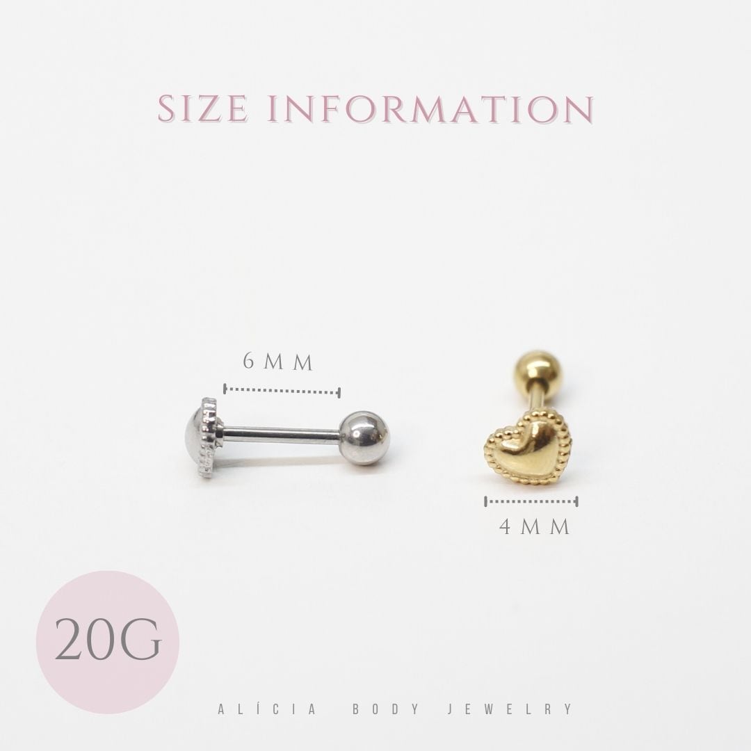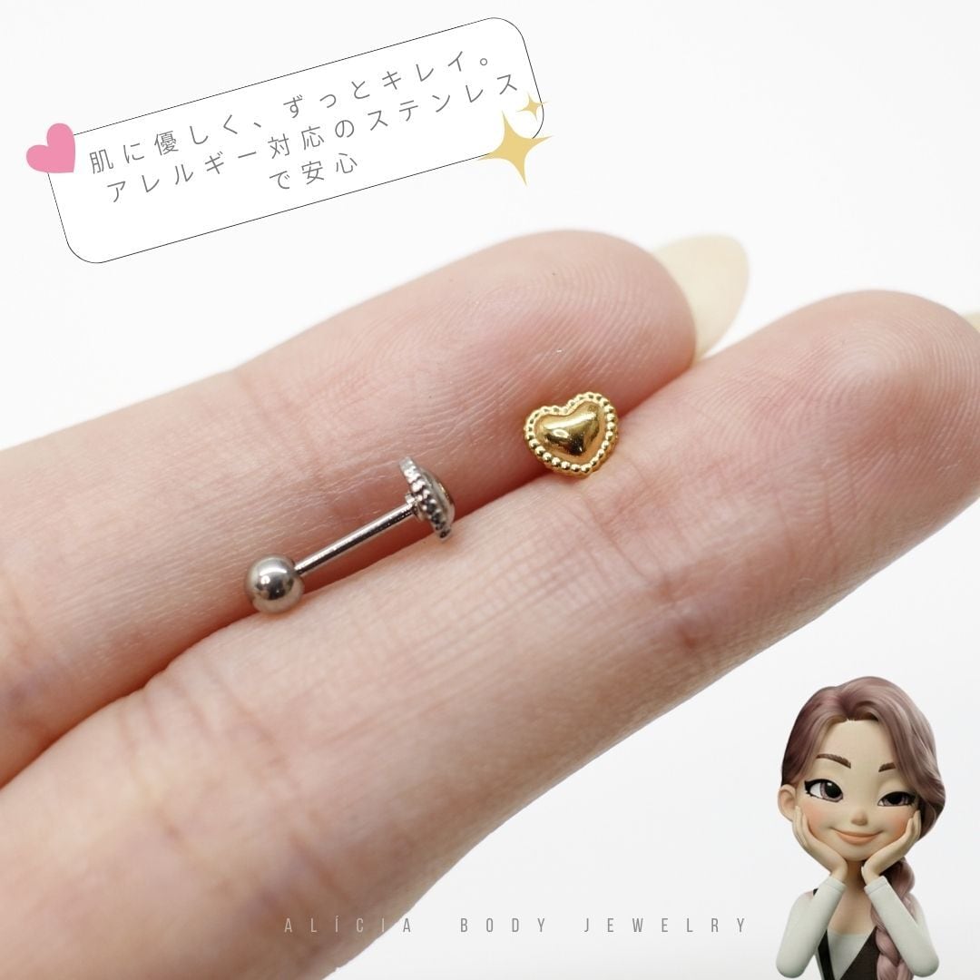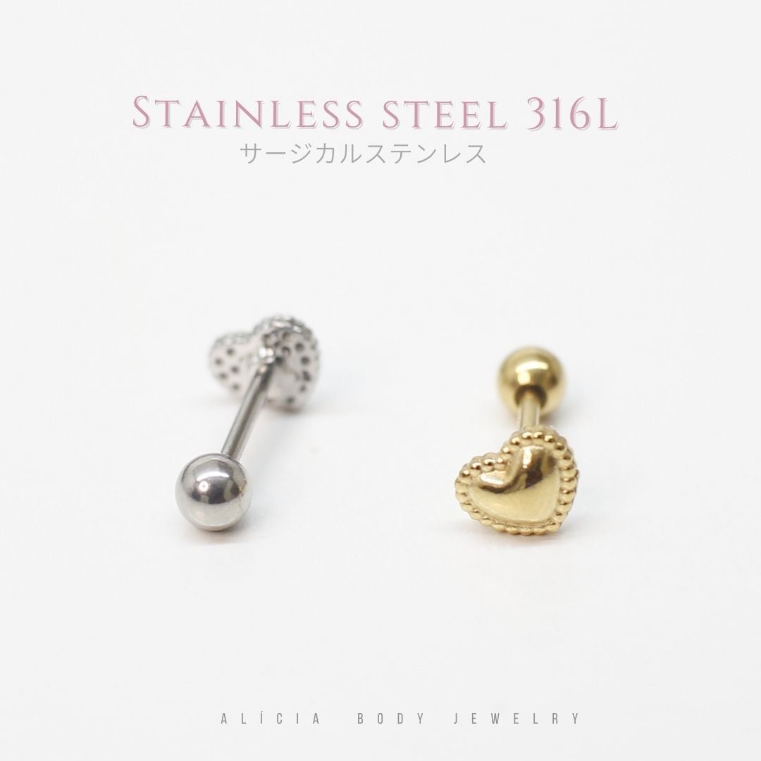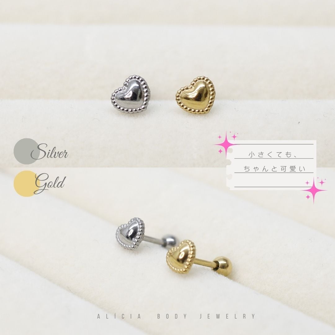 繊細なドット装飾が施された、立体感のあるハートモチーフのストレートバーベルピアス。
